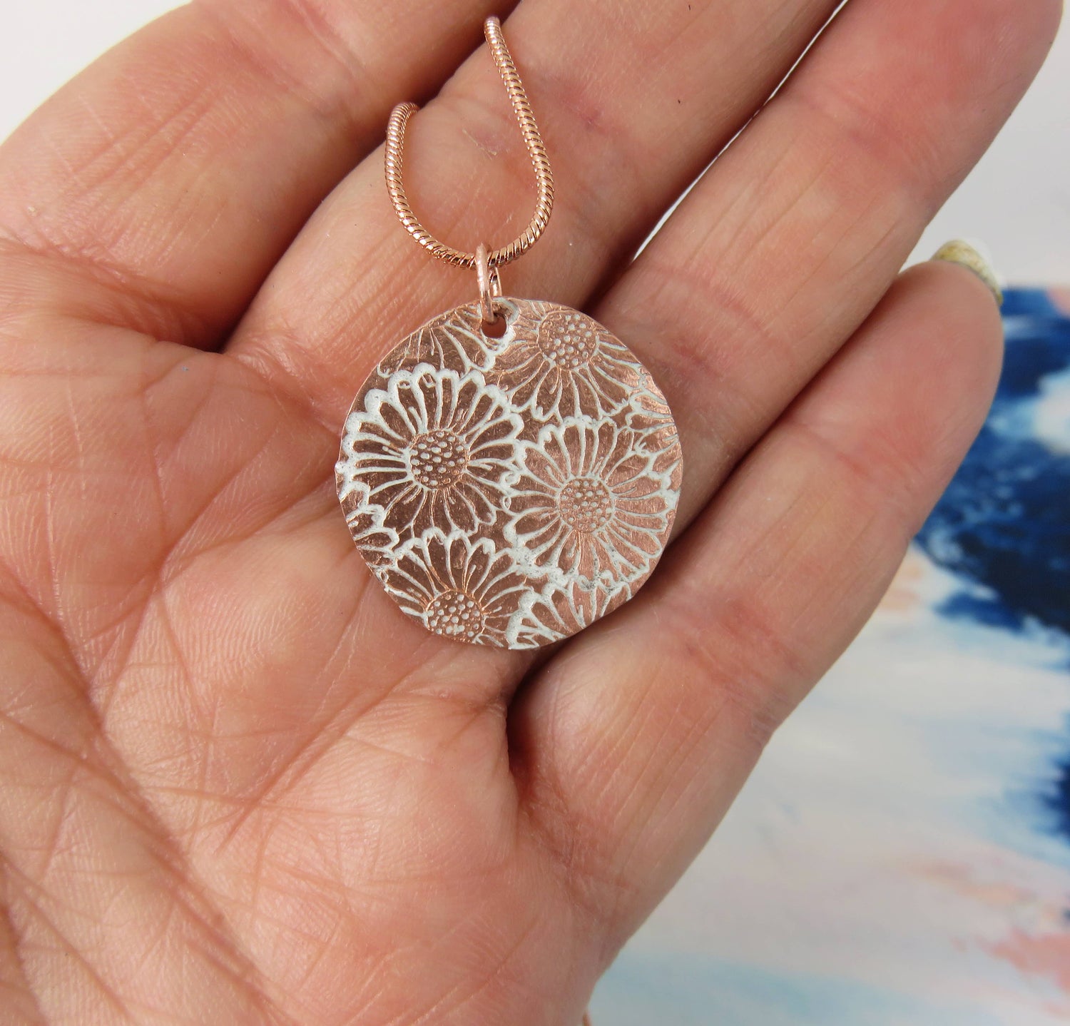 - A 22mm copper circle has been textured with a daisy pattern.