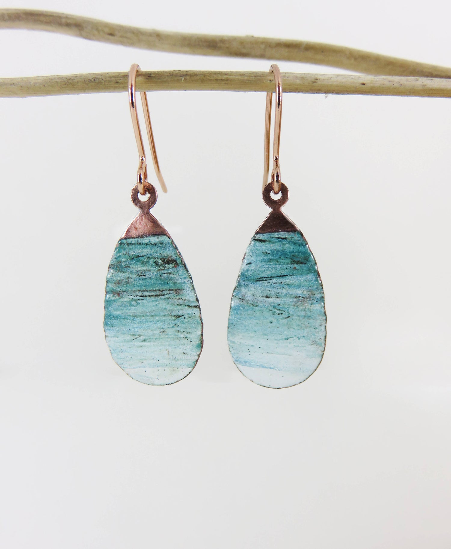 - Teardrop copper dangle earrings textured by hand with repeated hammered lines and washed with a white and jade enamel.